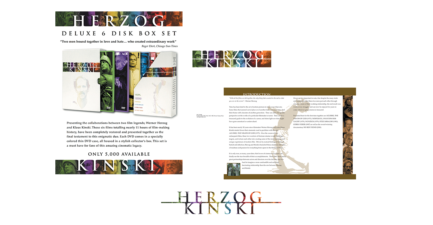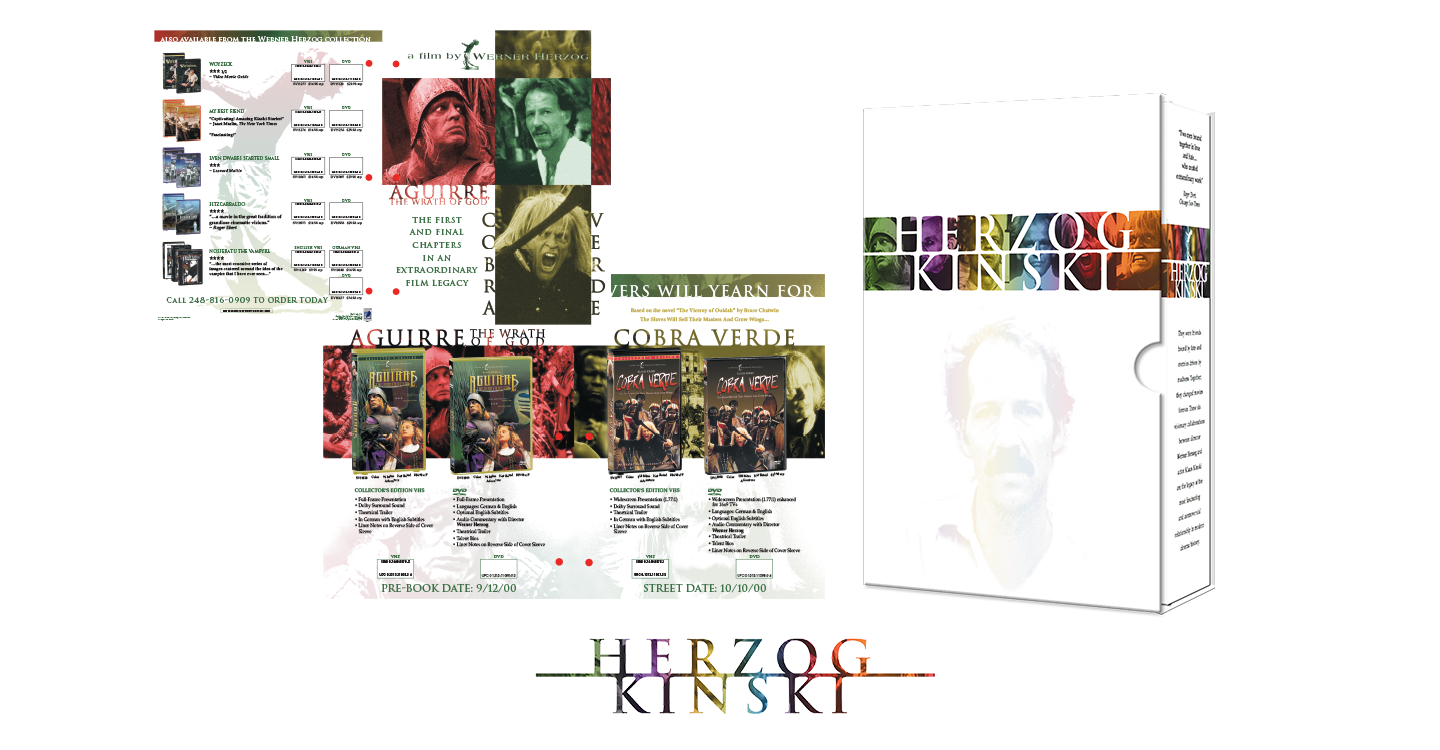 The roots of the project began with a flyer for a couple of projects I had worked on. The flyer was for the release of the Werner Herzog/Klaus Kinski collaborations, Aguirre, the Wrath of God, and Cobra Verde. The typical flyer format at that time was pretty simple, 3D pack shots over a simple background, often a still, texture or gradient, with stills from the movie as insets, plus all the standard copy points