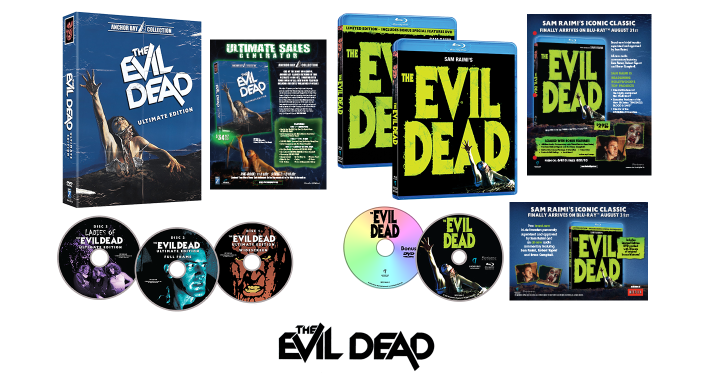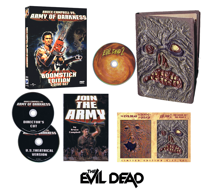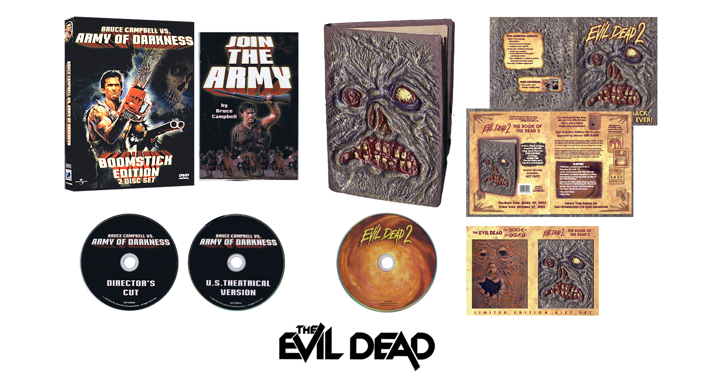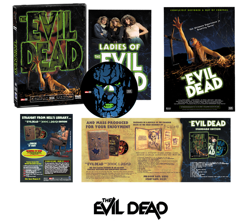 My association with The Evil Dead spans nearly my entire career at Anchor Bay. It began in 2001, with the release of The Evil Dead: The Book of the Dead. Anchor Bay had previously released The Evil Dead on VHS and DVD, with collectible cases & multiple covers to some success. They had similar success with its two sequels Evil Dead II, and Army of Darkness, in regular and collectible (and even official bootleg) editions.