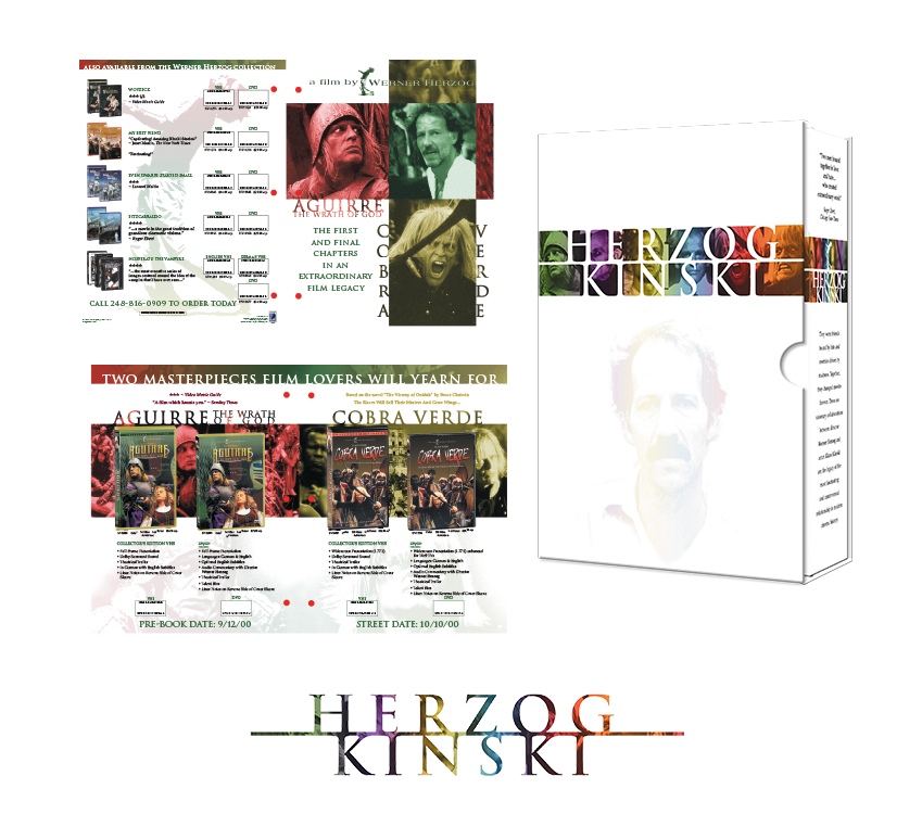 The roots of the project began with a flyer for a couple of projects I had worked on. The flyer was for the release of the Werner Herzog/Klaus Kinski collaborations, Aguirre, the Wrath of God, and Cobra Verde. The typical flyer format at that time was pretty simple, 3D pack shots over a simple background, often a still, texture or gradient, with stills from the movie as insets, plus all the standard copy points